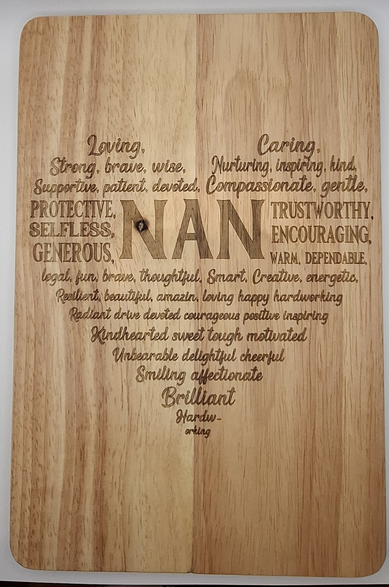 Celebrate the heart of the home with our Wooden Chopping Board – featuring “Mum” or “Nan” in bold letters at the center of a heart beautifully formed from loving words like Loving, Strong, Selfless, Caring, and more.