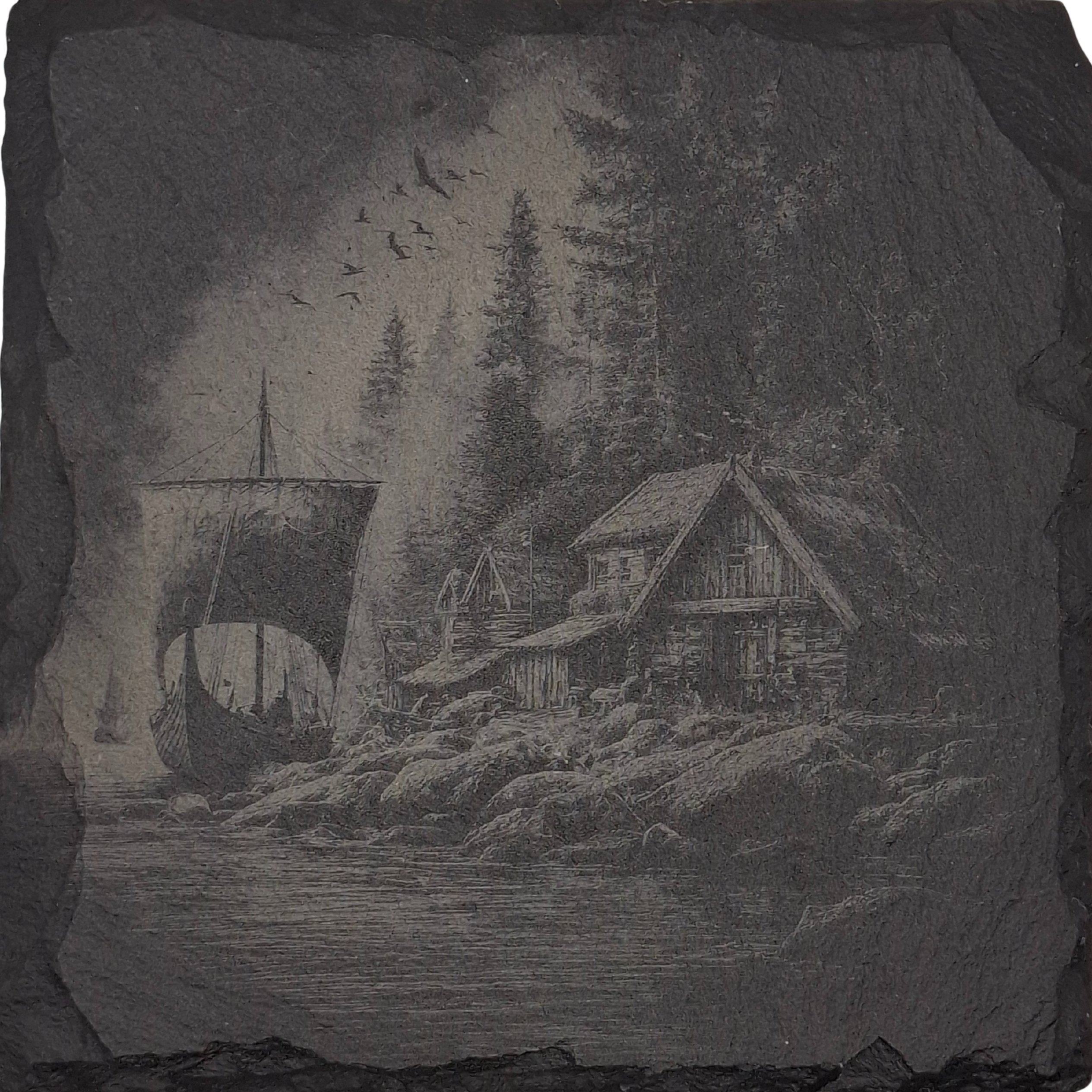 Laser engraved slate coasters featuring bold Viking designs, including Norse runes and warrior symbols. Made from natural slate for a durable, rugged finish.