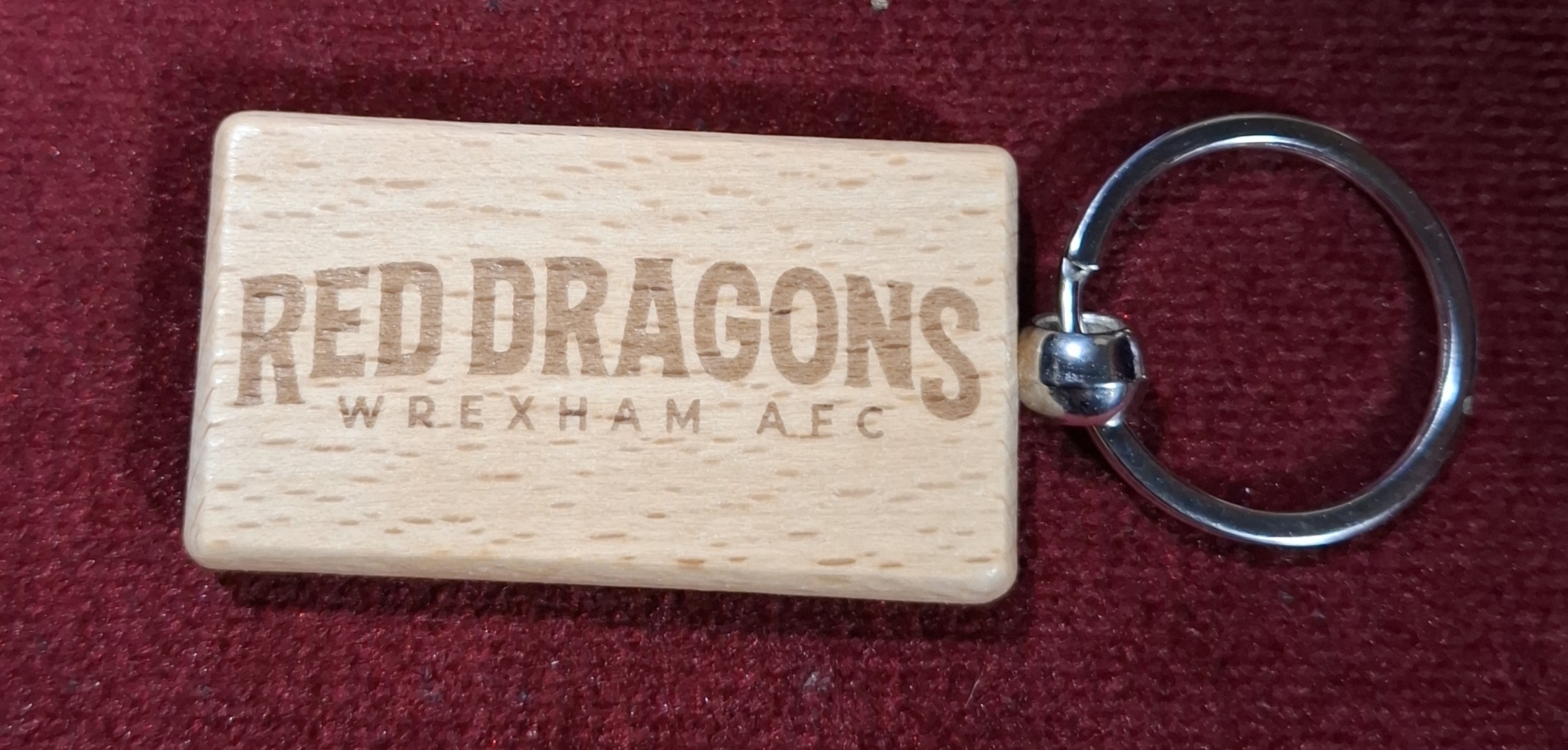 “Official Wrexham AFC bamboo keyring with metal ring attachment. Laser-engraved ‘Red Dragons Wrexham A.F.C.’ design – eco-friendly and perfect for loyal fans.”