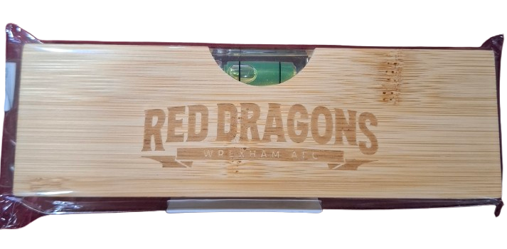 Show off your team pride with our Official Wrexham AFC Red Dragons Bamboo Spirit Level Bottle Opener – a clever, compact tool that’s as practical as it is fun. Featuring the official Red Dragons Wrexham AFC Wording and ribbon, this small spirit level doubles as a handy bottle opener cleverly inserted on the backside.
