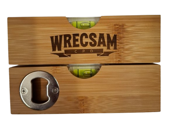 Show off your team pride with our Official Wrexham AFC Bamboo Spirit Level Bottle Opener – a clever, compact tool that’s as practical as it is fun. Featuring the official Wrecsam C P D word branding and ribbon, this small spirit level doubles as a handy bottle opener cleverly inserted on the backside.