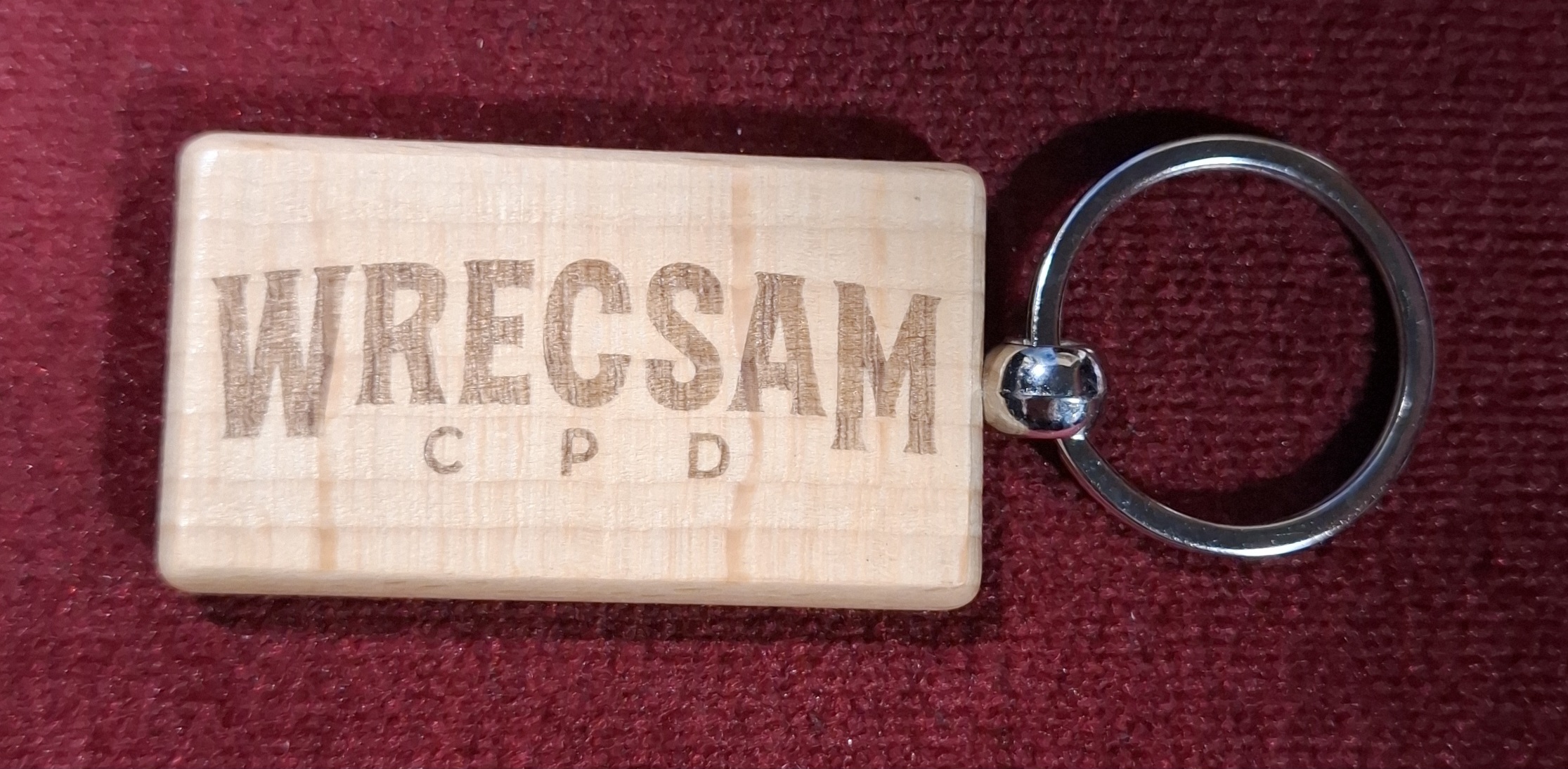 “Official Wrexham AFC bamboo keyring with metal ring attachment. Laser-engraved ‘Wrecsam C.P.D.’ design – eco-friendly and perfect for loyal fans.”